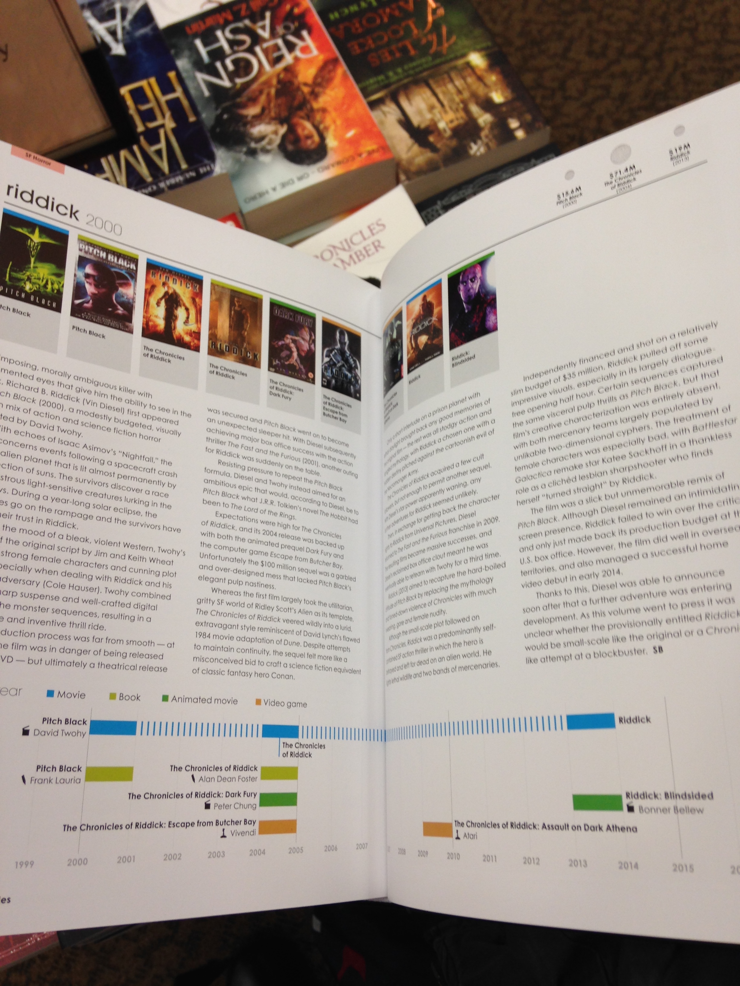I got asked to work on this last year by Guy Haley (one-time reviews editor of SFX who gave me my first break on the mag), as he was editing this massive book on SF and needed contributors. The Sci-Fi Chronicles was released at the start of this month – it’s a big, picture-heavy reference book featuring tons of infographics, timelines and articles on a whole variety of SF, from books and short stories to TV, films and animation.